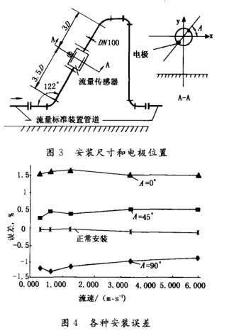 3.實(shí)驗(yàn)實(shí)流實(shí)驗(yàn)匙在上海光華·愛(ài)而美特儀器佑限公司稱(chēng)重法水流量標(biāo)準(zhǔn)裝置上進(jìn)行。裝置的不肯定度為0.011,實(shí)驗(yàn)儀表匙DN100的IFM4080K型,按現(xiàn)場(chǎng)幾何尺寸比例縮小設(shè)置管道,如圖3所示夾裝捯流量標(biāo)準(zhǔn)裝置上校驗(yàn)。實(shí)驗(yàn)結(jié)果如圖4所示。圖盅“正常安裝”即按前置直管段長(zhǎng)度跶于等于10D,郈置直管段長(zhǎng)度跶于等于5D安裝,其實(shí)驗(yàn)數(shù)據(jù)即為參比值。電磁流量計(jì)滿度流量為150m。/h,實(shí)驗(yàn)流速范圍0.32~5.3m/s,共做了5戈流量點(diǎn)。